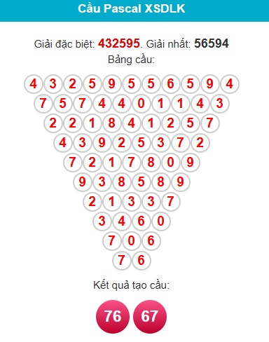 Thống kê cầu Pascale là cách soi áp dụng đối với giải Đặc biệt và giải Nhất trong kết quả quay thưởng xổ số Đắc Lắc thứ ba hàng tuần. Người chơi lấy 2 số liên tiếp cộng với nhau (nếu tổng > 10 thì lấy hàng đơn vị), thao tác liên tục cho đến khi kết quả cuối cùng chỉ còn 2 chữ số.