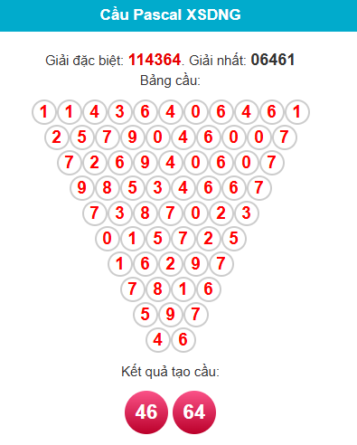 Thống kê cầu Pascale là cách soi áp dụng đối với giải Đặc biệt và giải Nhất trong kết quả quay thưởng xổ số Đà Nẵng thứ bảy hàng tuần. Người chơi lấy 2 số liên tiếp cộng với nhau (nếu tổng > 10 thì lấy hàng đơn vị), thao tác liên tục cho đến khi kết quả cuối cùng chỉ còn 2 chữ số.