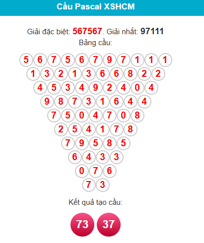 Thống kê cầu Pascale là cách soi áp dụng đối với giải Đặc biệt và giải Nhất trong kết quả quay thưởng xổ số TP Hồ Chí Minh thứ hai hàng tuần. Người chơi lấy 2 số liên tiếp cộng với nhau (nếu tổng > 10 thì lấy hàng đơn vị), thao tác liên tục cho đến khi kết quả cuối cùng chỉ còn 2 chữ số.