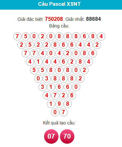 Thống kê cầu Pascale là cách soi áp dụng đối với giải Đặc biệt và giải Nhất trong kết quả quay thưởng SXNT thứ sáu hàng tuần. Người chơi lấy 2 số liên tiếp cộng với nhau (nếu tổng > 10 thì lấy hàng đơn vị), thao tác liên tục cho đến khi kết quả cuối cùng chỉ còn 2 chữ số.