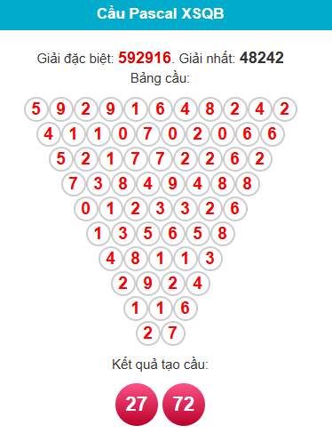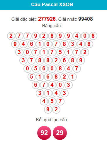 Thống kê cầu Pascale là cách soi áp dụng đối với giải Đặc biệt và giải Nhất trong kết quả quay thưởng xổ số SXQB thứ năm hàng tuần. Người chơi lấy 2 số liên tiếp cộng với nhau (nếu tổng > 10 thì lấy hàng đơn vị), thao tác liên tục cho đến khi kết quả cuối cùng chỉ còn 2 chữ số.