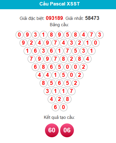 Thống kê cầu Pascale là cách soi áp dụng đối với giải Đặc biệt và giải Nhất trong kết quả quay thưởng xổ số Sóc Trăng thứ tư hàng tuần. Người chơi lấy 2 số liên tiếp cộng với nhau (nếu tổng > 10 thì lấy hàng đơn vị), thao tác liên tục cho đến khi kết quả cuối cùng chỉ còn 2 chữ số.