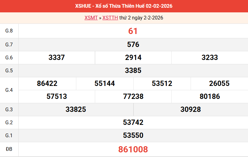 1. Thống kê xổ số Thừa Thiên Huế 08/02/2026