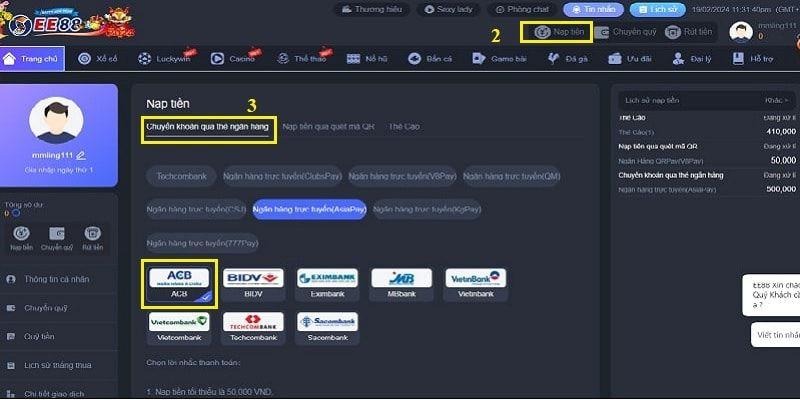 Phương thức nạp tiền EE88 này được nhiều người lựa chọn nhờ tính phổ biến và thao tác đơn giản: