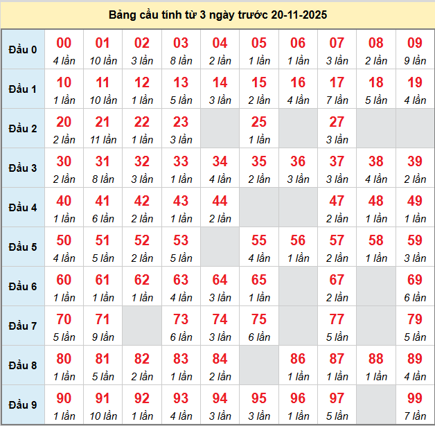 Tham khảo ngay các dự đoán ngày 20/11/2025, cầu lô có xác suất ra về cao nhất hôm nay được cung cấp bởi đội ngũ chuyên gia giàu kinh nghiệm bằng sự phân tích kỹ lưỡng quy luật cầu động dựa trên 107 vị trí cầu của bảng kết quả như sau: