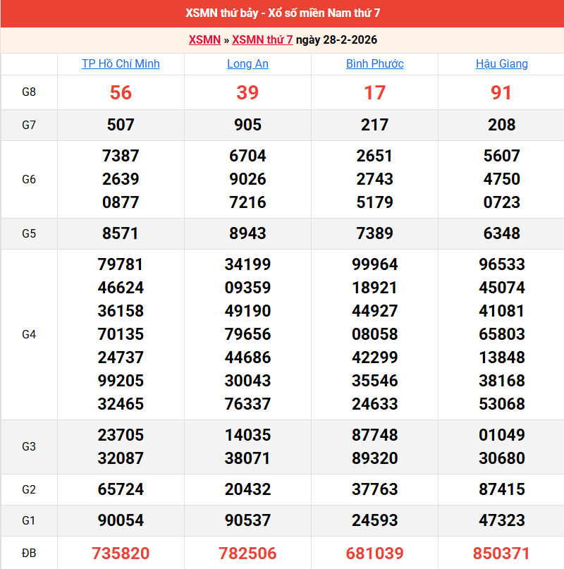 Bảng kết quả xổ số miền Nam ngày 28/02/2026