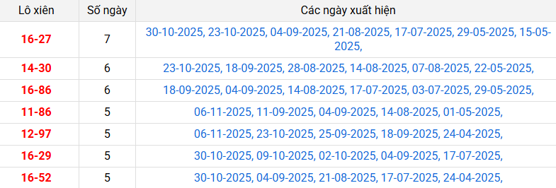 ⭐ Cặp số lô tô về nhiều nhất: 16 - 14 - 27 - 52 - 30
