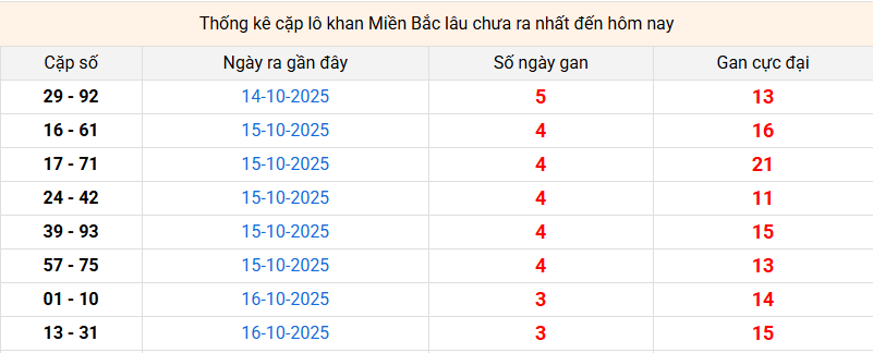 Thống kê cặp lô gan miền bắc ngày 20/10/2025 |