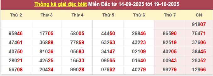 Thống kê 2 số cuối giải đặc biệt XSMB theo tuần ngày 20/10/2025