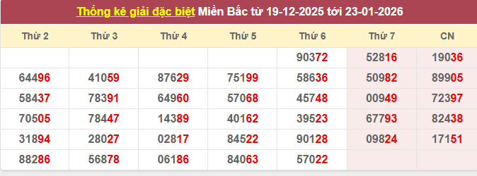 Thống kê 2 số cuối giải đặc biệt XSMB theo tuần ngày 24/01/2026