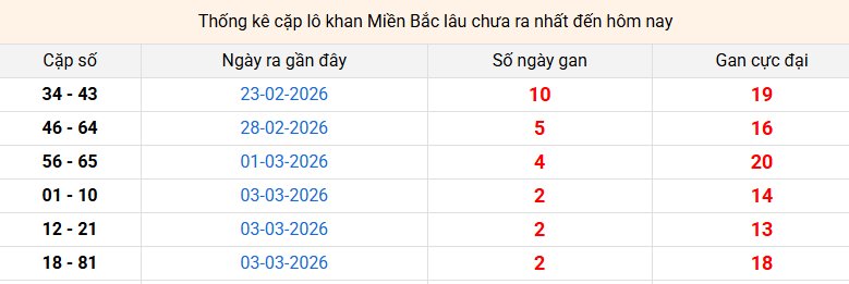 Thống kê cặp lô gan miền bắc ngày 06/03/2026 |