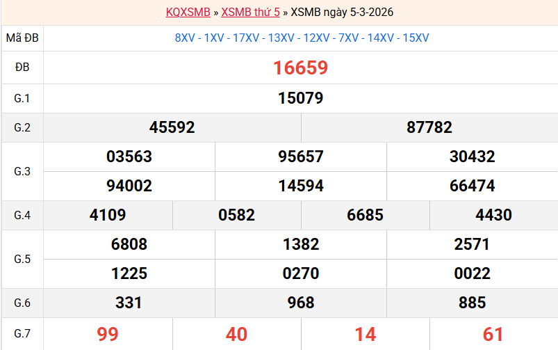 Kết quả xổ số miền Bắc ngày 05/03/2026