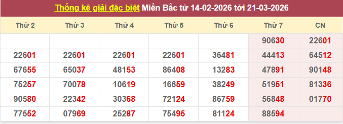 Thống kê 2 số cuối giải đặc biệt XSMB theo tuần ngày 22/03/2026
